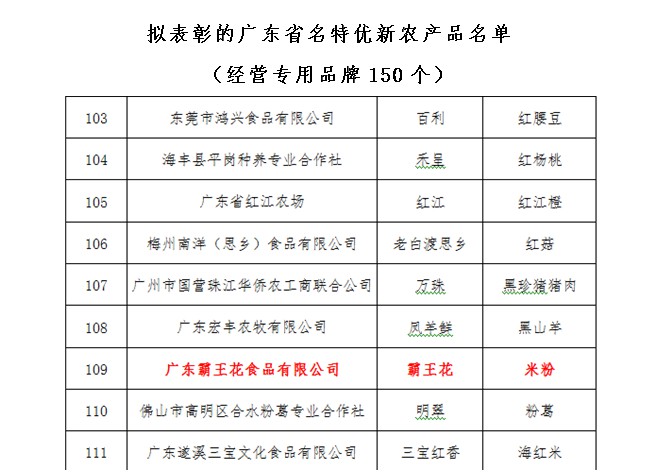 據(jù)了解,首屆廣東省名特優(yōu)新農(nóng)產(chǎn)品11月26日公示結(jié)束。經(jīng)廣東省名特優(yōu)新農(nóng)產(chǎn)品評選委員審定,有300個品牌農(nóng)產(chǎn)品獲省名特優(yōu)農(nóng)產(chǎn)品榮譽稱號,我市共有12個經(jīng)營專用品牌、5個區(qū)域品牌榜上有名,其中,霸王花為12個經(jīng)營專用品牌之一。